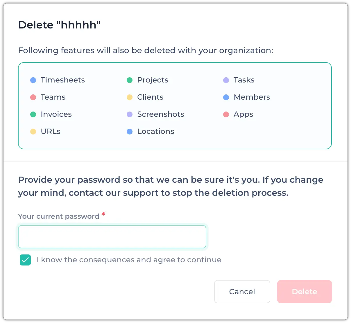 - Inform your team: Once deleted, members will lose access to all organization data and history.