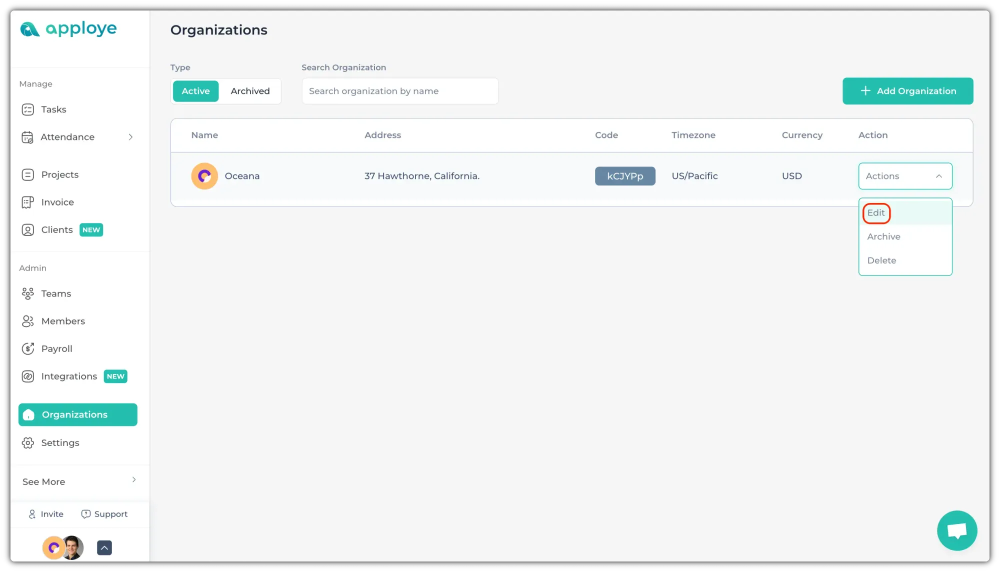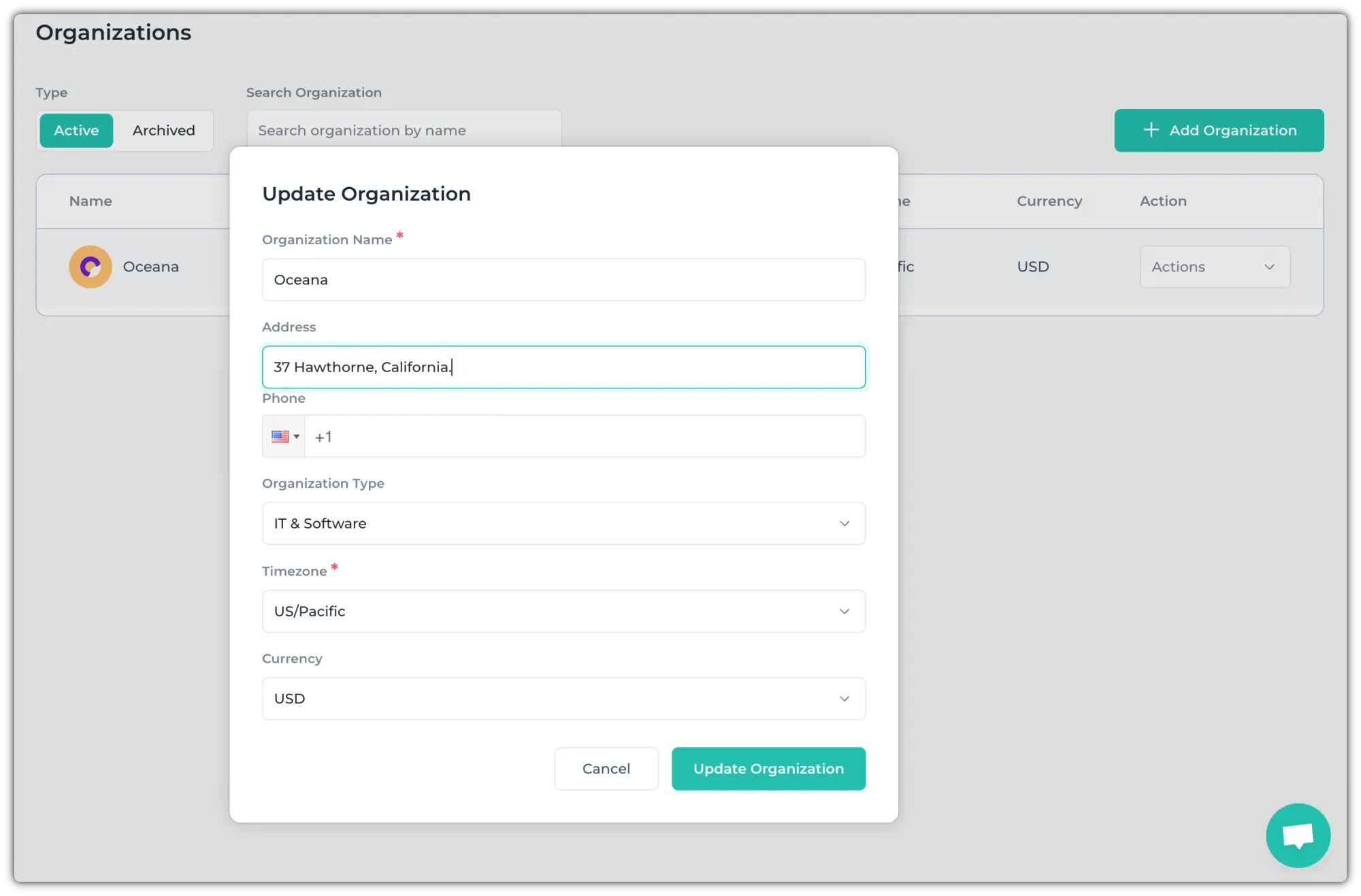 A pop-up will open. You will be able to edit your organization's information from here, e.g., Organization name, address, timezone, currency, etc.