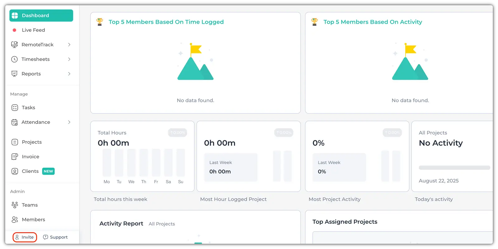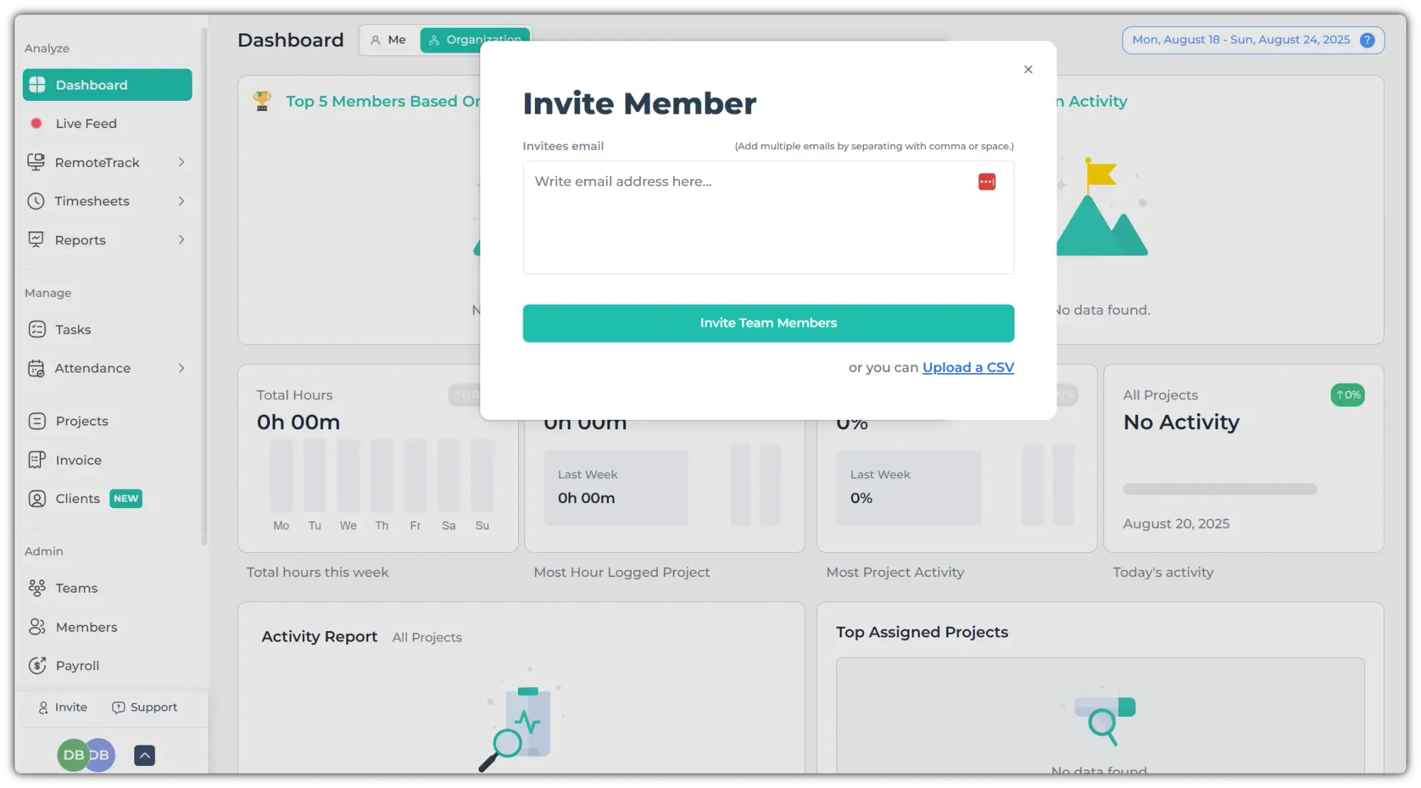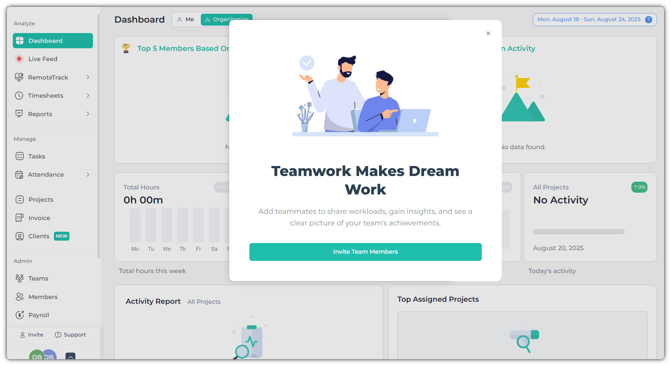 You are prompted to invite members after signing up for Apploye. You will see this pop-up: