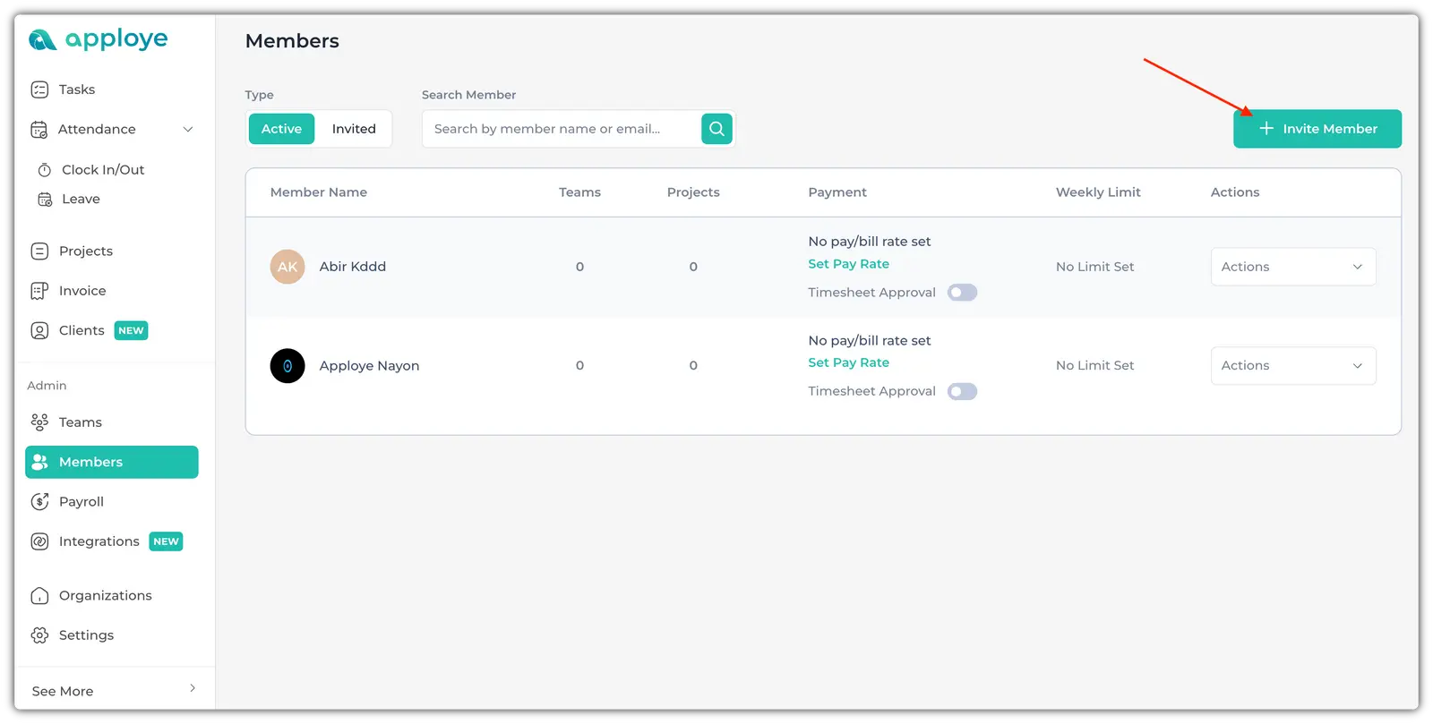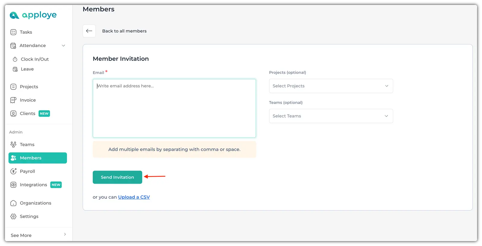 Click on "Invite Team Members" to invite the members. Now, give the email addresses for the members to invite them to Apploye.
