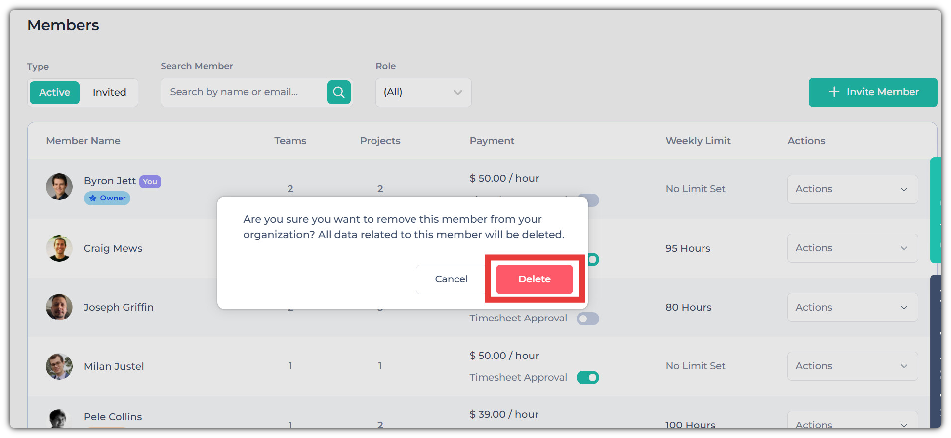 After you click Delete, all data associated with the member will also be deleted.
