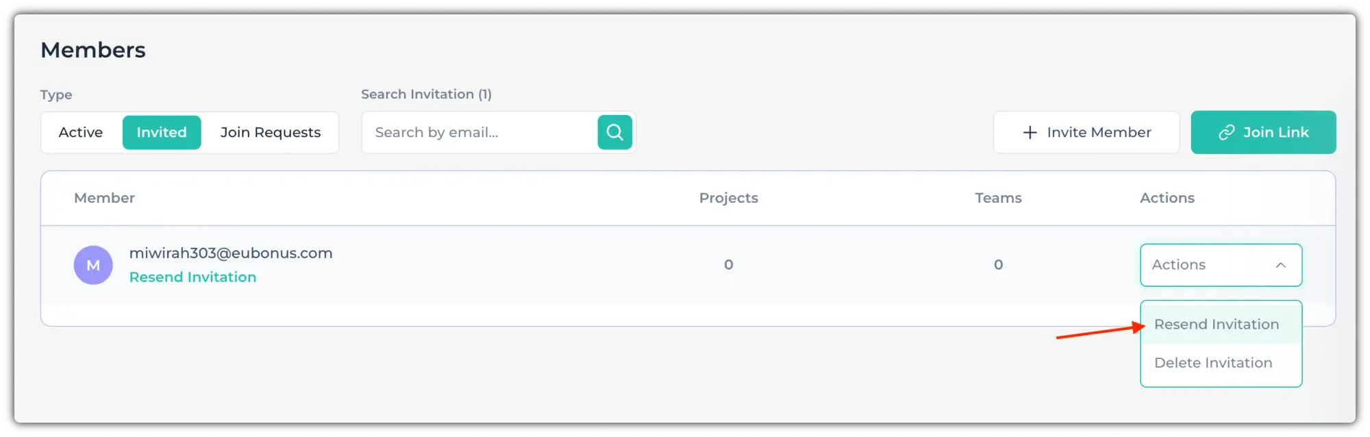 Click on "Resend Invitation" from the Actions Dropdown menu to resend the invitation.