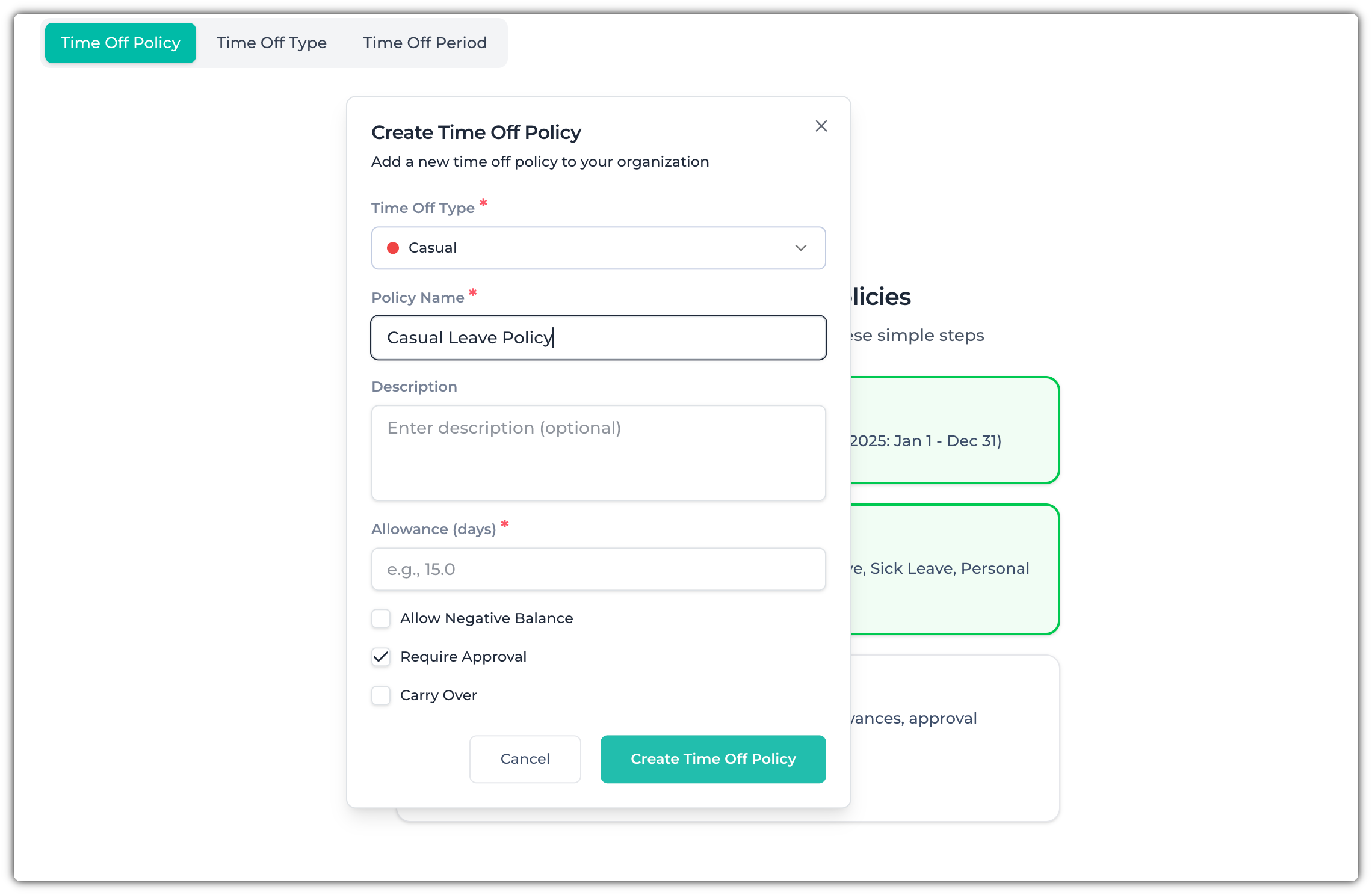 It will open a pop-up. Now, select the leave type, give it a name, and choose the number of days for this leave type. You can also choose whether to allow a negative balance, require approval, and if leave can carry over to the next leave period.