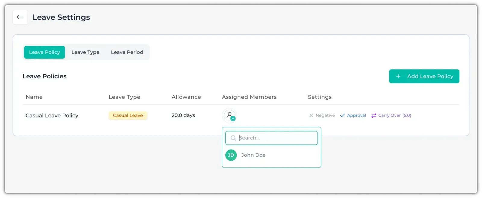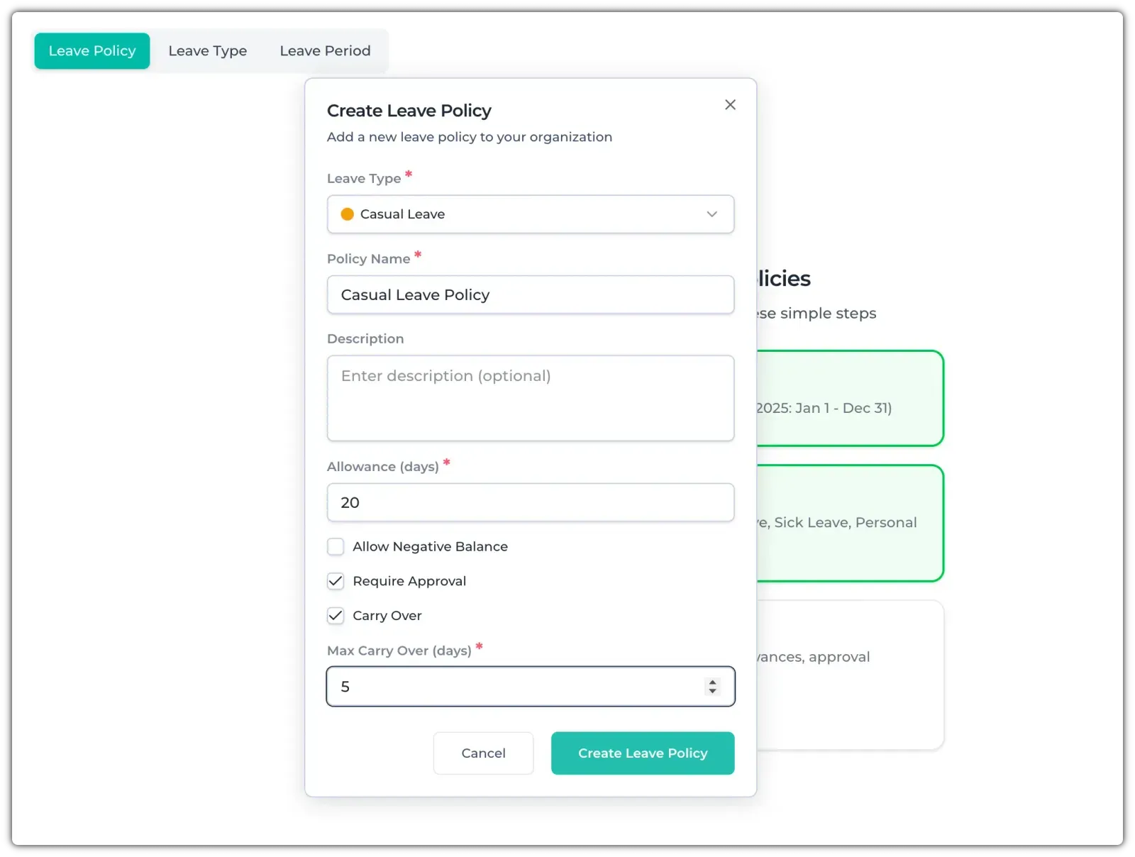 It will open a pop-up. Now, select the leave type, give it a name, and choose the number of days for this leave type. You can also choose whether to allow negative balance, require approval, and if leave can carry over to the next leave period.