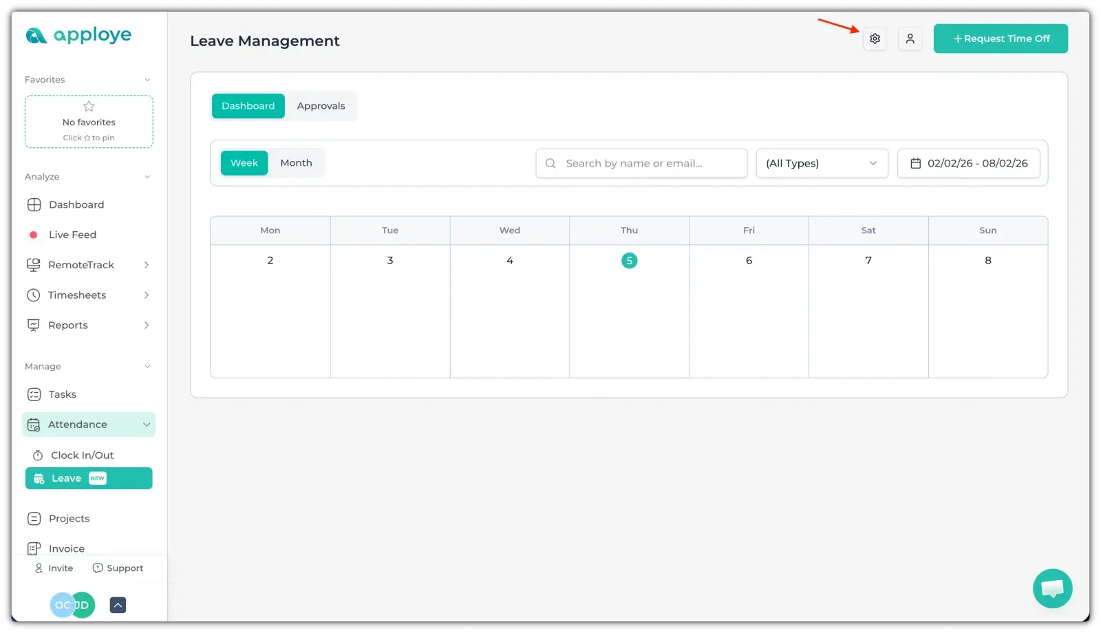Before you ask employees to apply for leave, you need to create a Leave Policy. To create/edit the leave policy, click on the settings icon.
