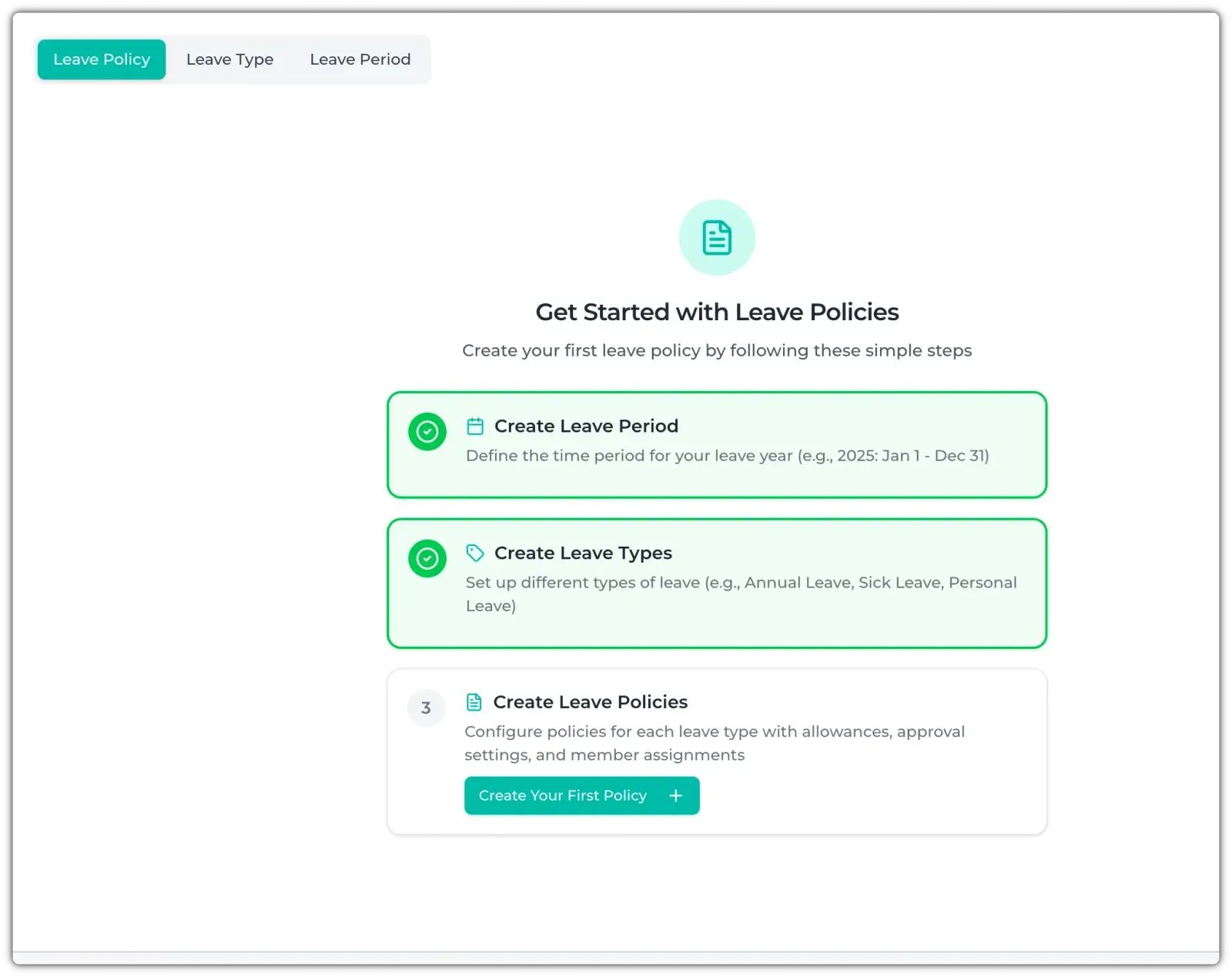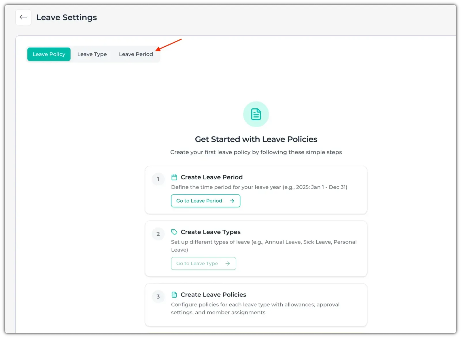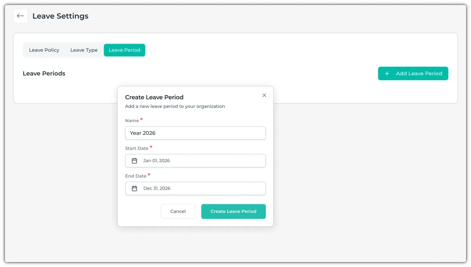 Go to "Leave Period". Click on "+ Add Leave Period". Select the duration you want for the leave period. For most organizations, it will likely be the calendar year or the fiscal year.