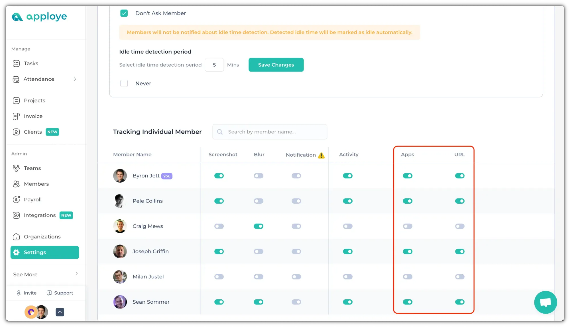 Apploye keeps an eye on inactivity. If someone hasn’t moved the mouse or typed for a while, it will be logged as idle time. Long periods of inactive time will be marked as idle.