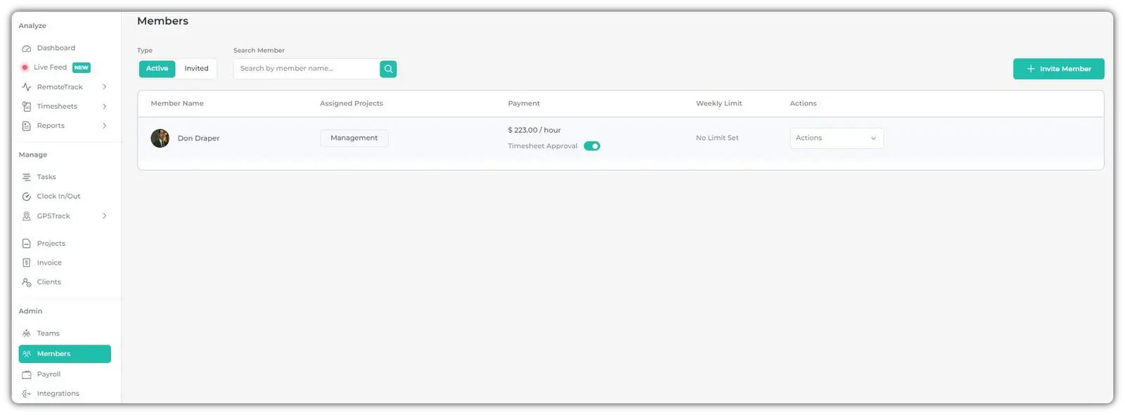 š You can enable or disable timesheet approval for any or all members from this section. There is an option to apply this setting for all members at once by clicking the 'Turn On' or 'Turn Off' button.