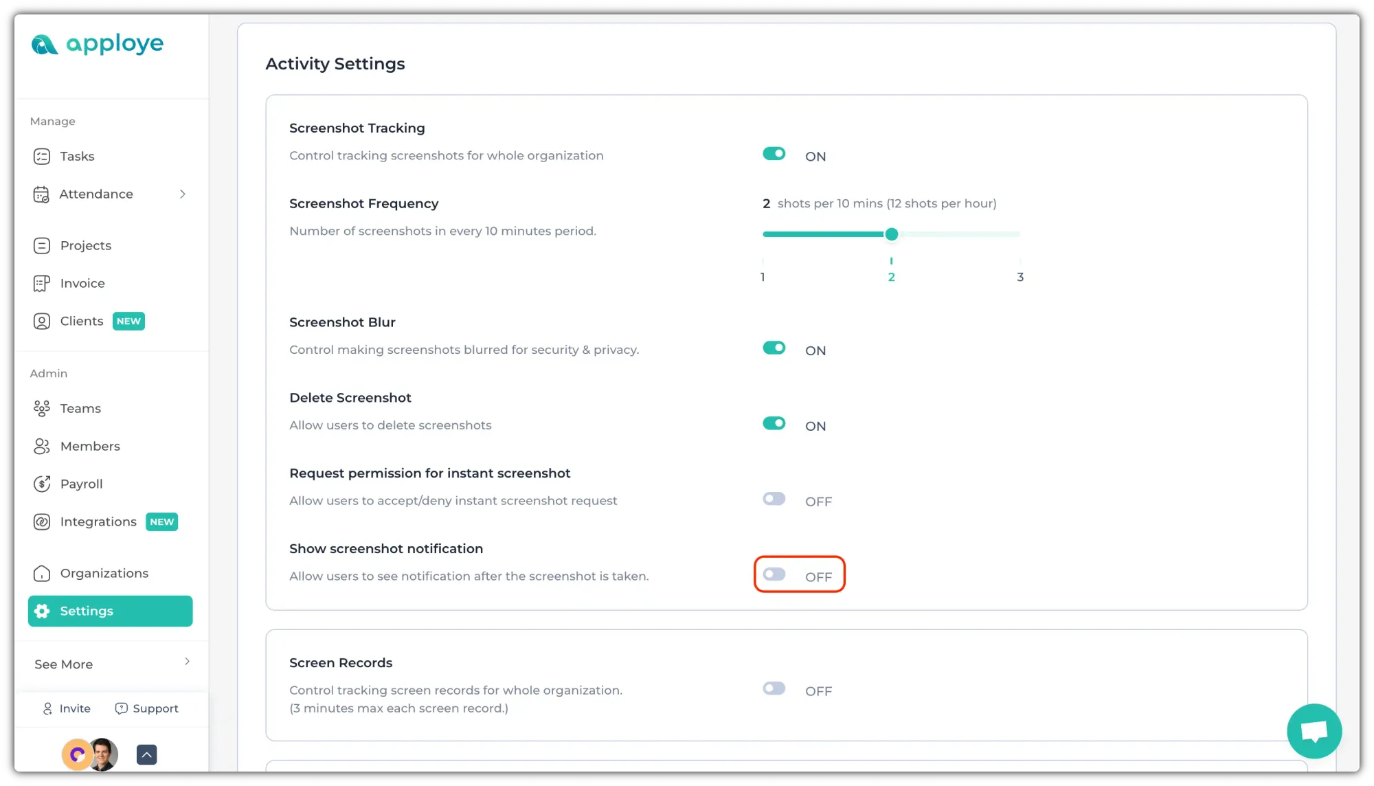 When the Screenshot notification is off, Apploye still captures screenshots according to your monitoring settings. But, employees will not get any option to turn on their notification, from the desktop app.