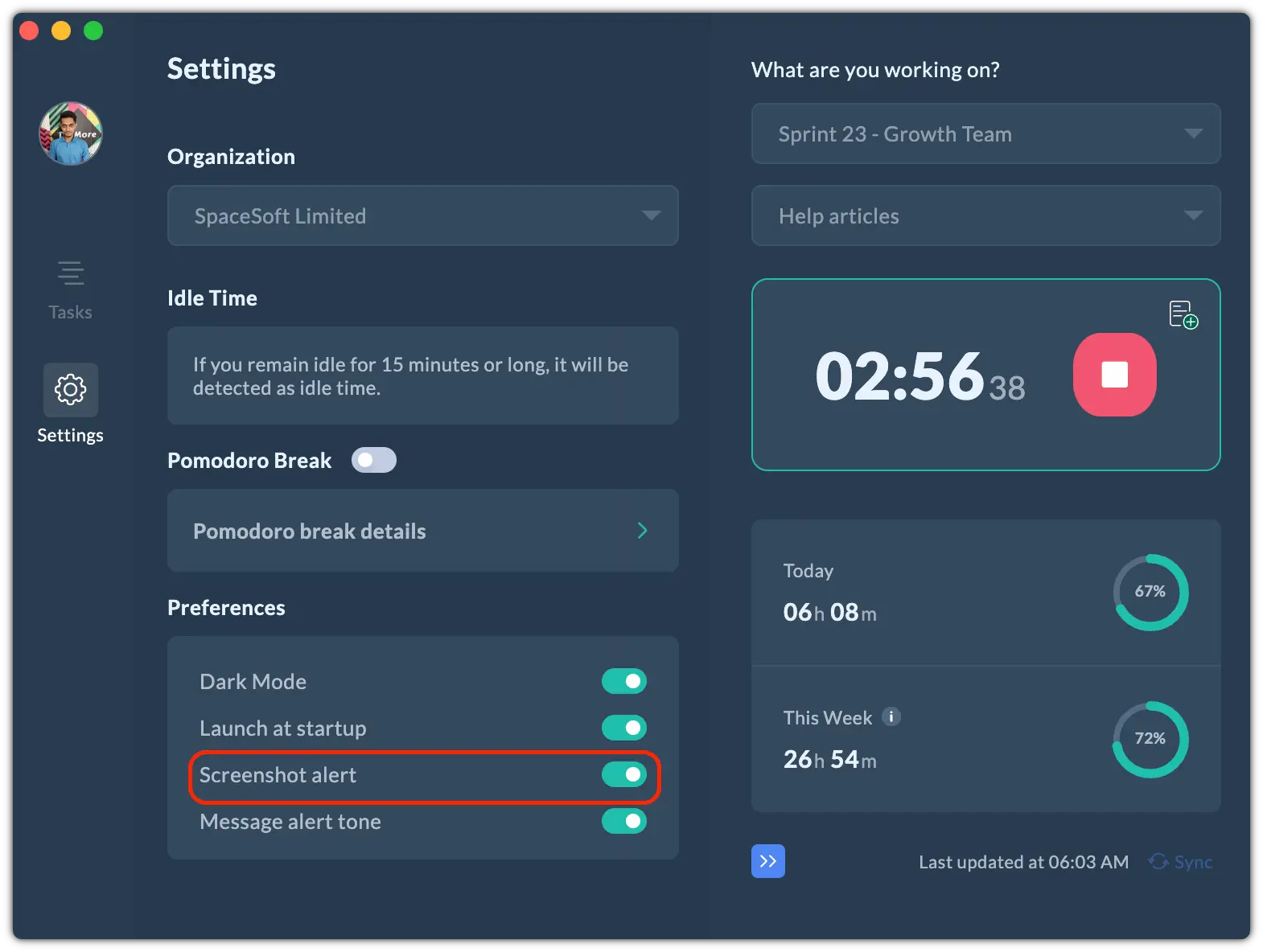 Once you update the setting in the web app, Apploye desktop apps will follow it automatically for that organization. If the settings are enabled, the members can turn on/off "Screenshot Alert" from the settings of the desktop app.
