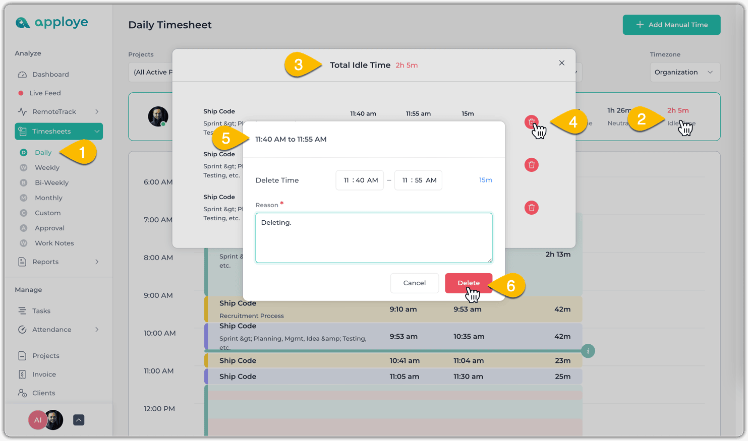 👉 To view/delete idle time, you have to go to the Daily/Weekly/Monthly/Custom Timesheet section. To check the Daily Timesheet, please you may go to Timesheets>Daily. In the following image, follow the numbered steps to delete an idle time.