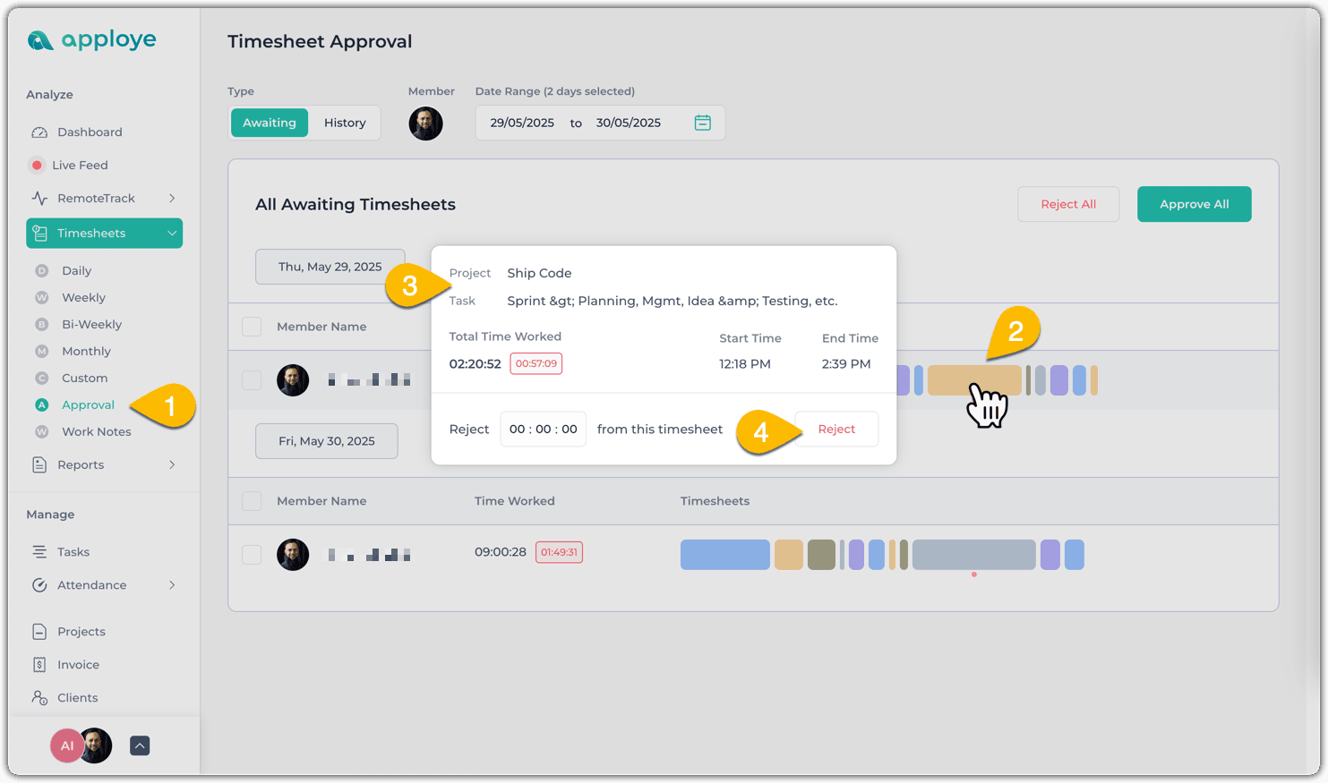 👉 If you go to Timesheet Approval, you will be able to see idle time by each day or timesheets as well. If you don't want to delete the idle time, you can reject that amount of time to omit idle time from the payroll.