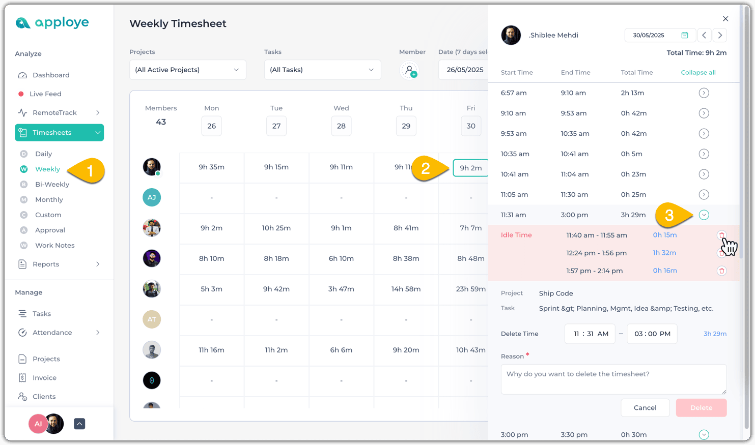 👉 You can also delete/check idle time from weekly/monthly/custom timesheets, click on any day, and then click on the down arrow icon to expand that timesheet.
