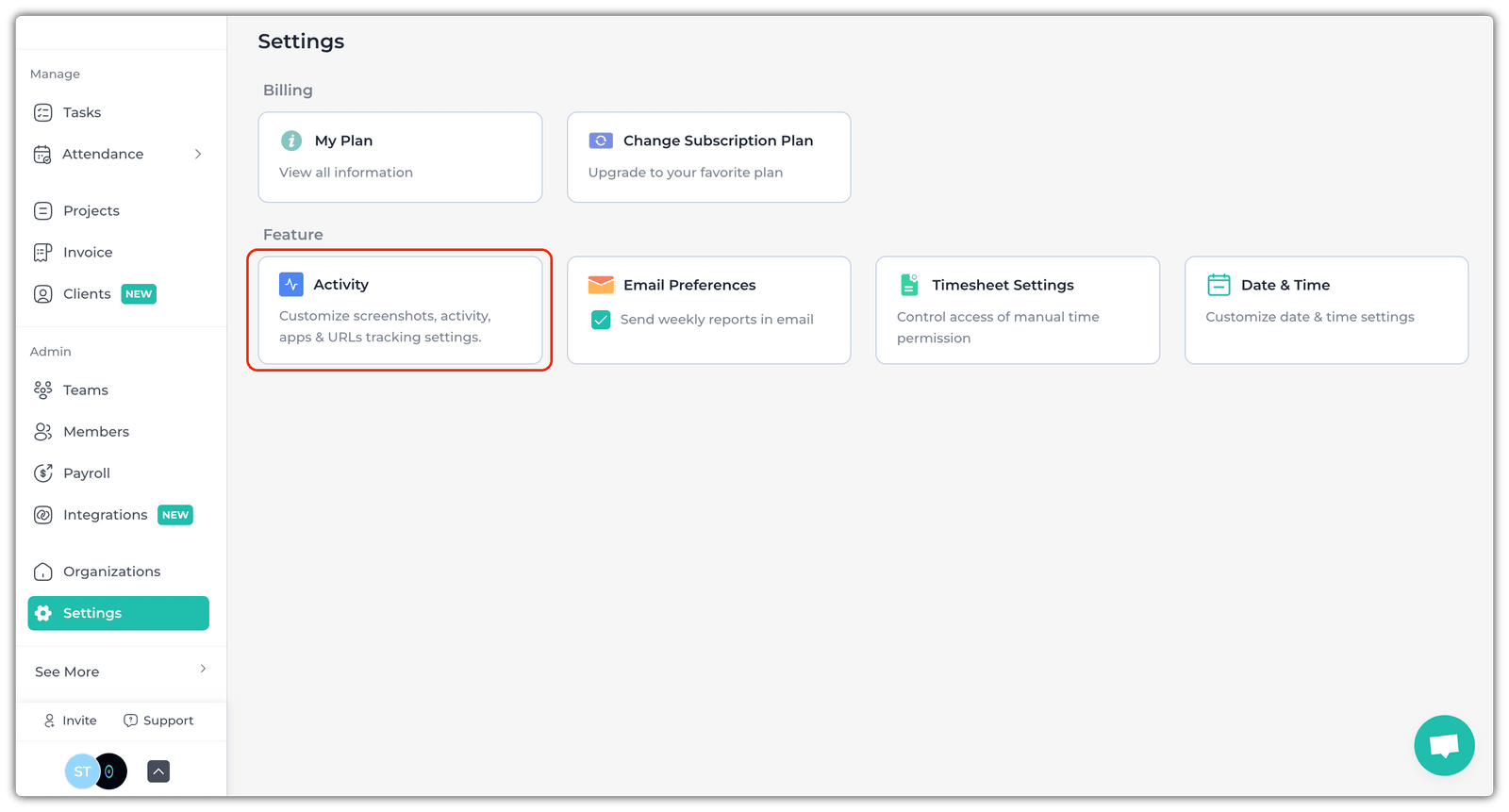 The organization owner/admin can turn off the option of deleting screenshots for the users. First, Go to Settings> Activity.