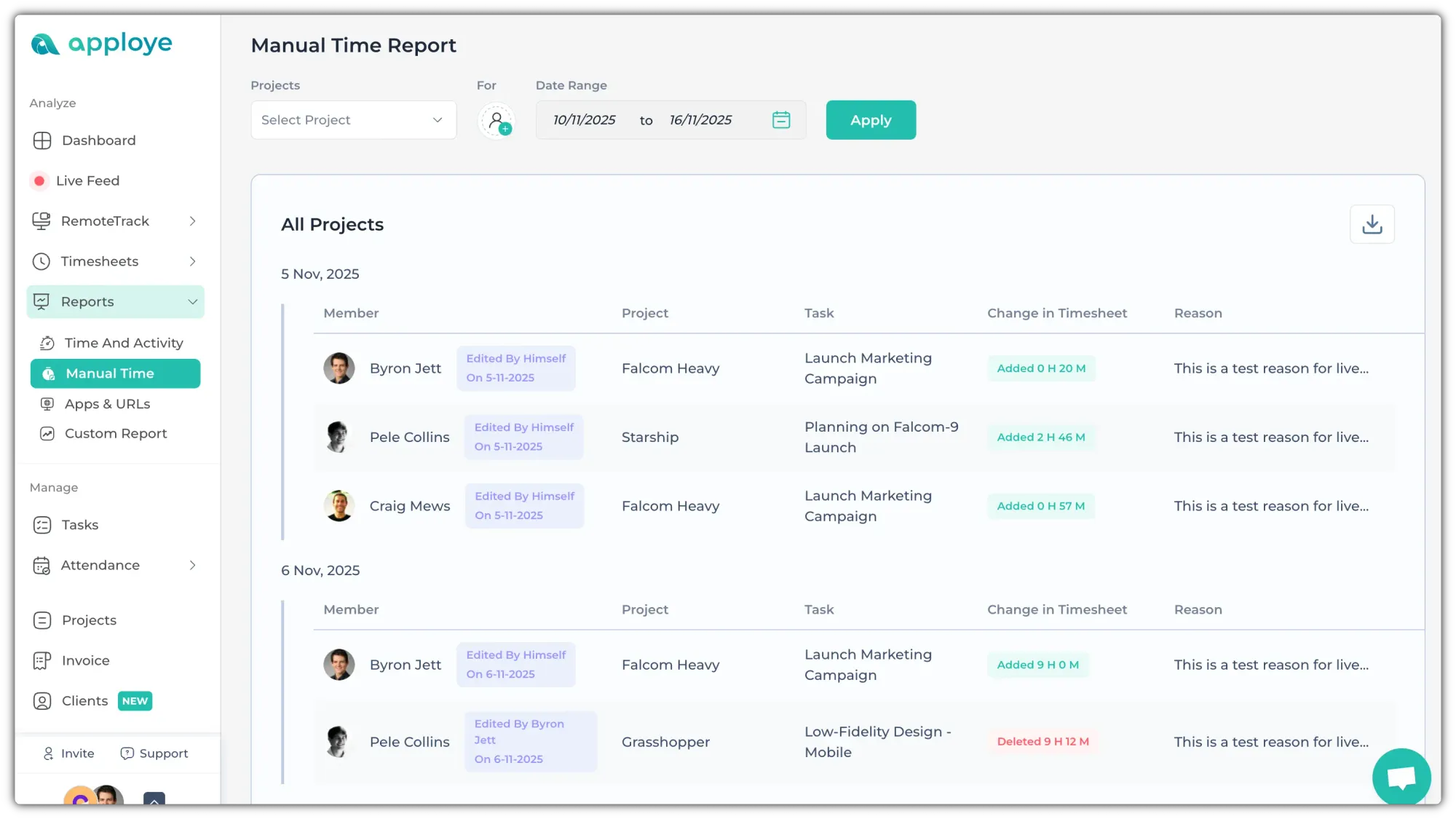 Lists all manually added time entries, including member name, project, date, and duration. If any members delete a screenshot or update a timesheet, you can find it here.
