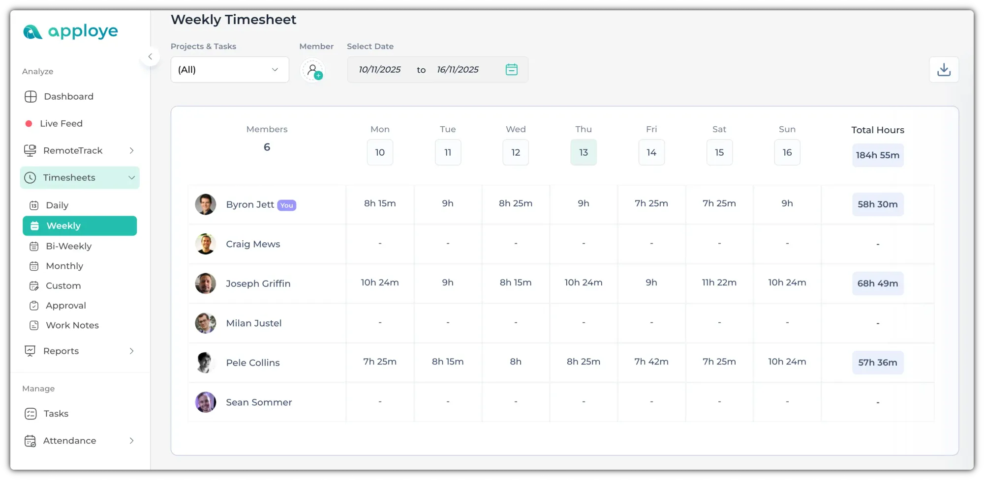 The Timesheet displays the total tracked hours and activity levels of each team member for a selected period.