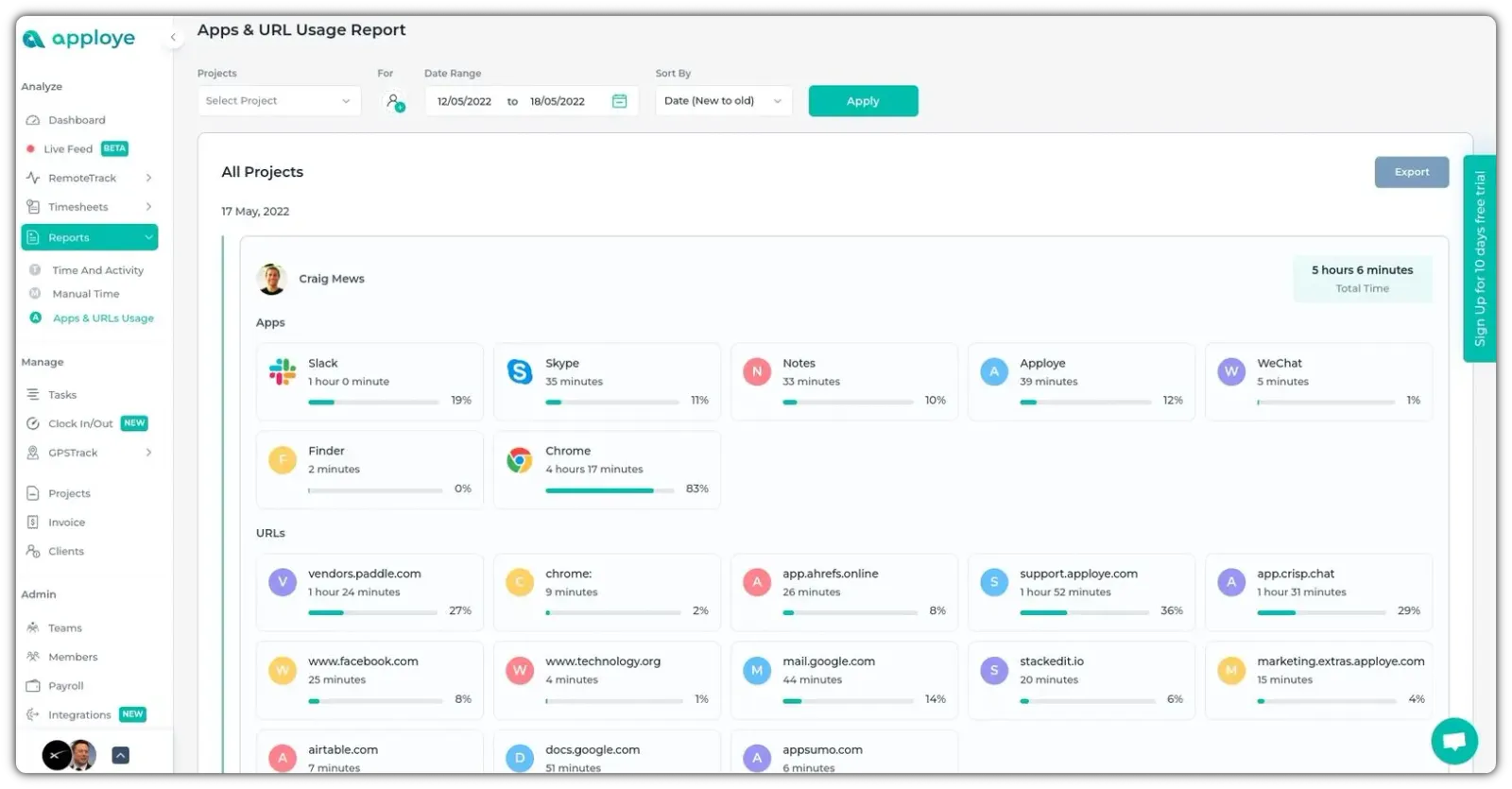 All reports in Apploye can be exported in CSV or PDF format. Few also have the option to choose a decimal format for easier calculations.